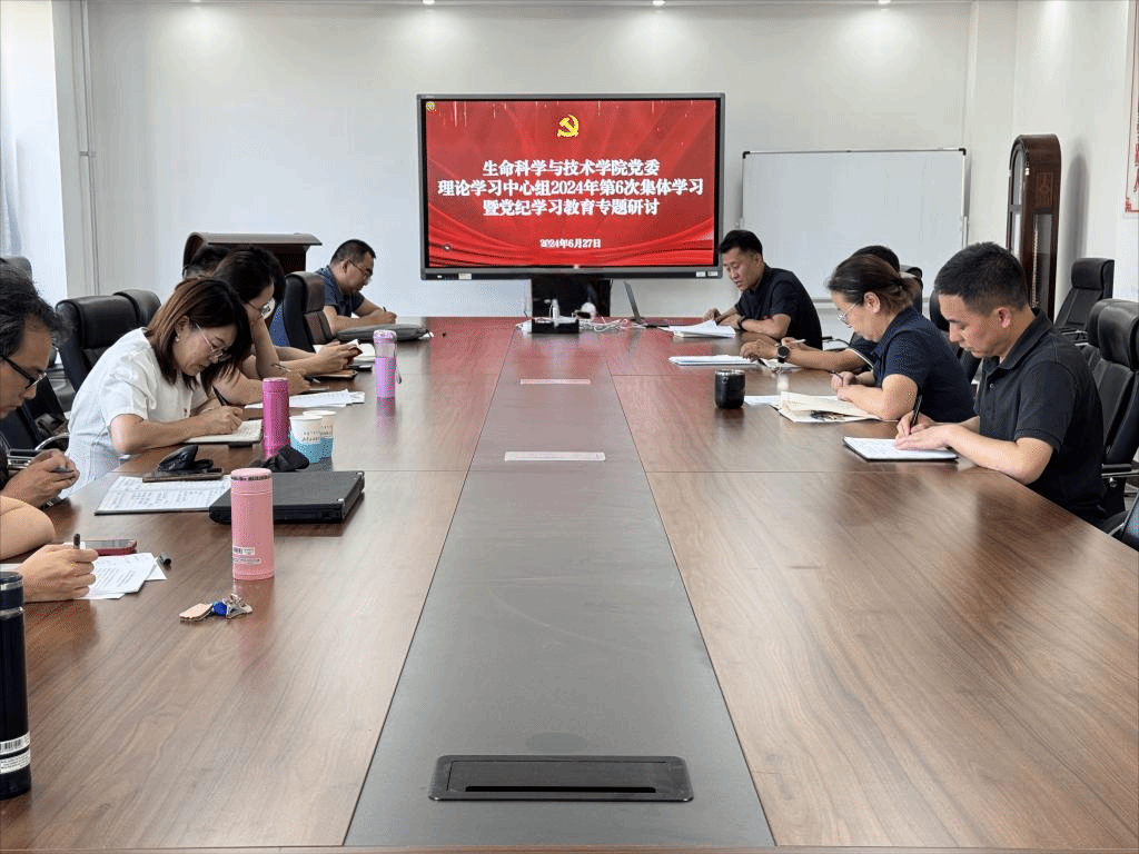 6月27日下午,suncitygroup太阳新城官网党委在生物楼三楼会议室召开党委理论学习中心组2024年第6次集体学习暨党纪学习教育专题研讨。学院党委理论学习中心组成员参加会议。学习会由学院党委书记苏小波主持。