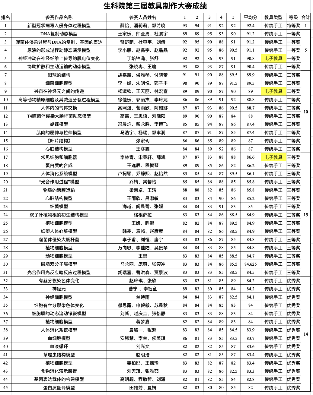 决赛当天,选手们提前到达比赛场地,将自己的作品放到指定位置,比赛开始后选手向评委老师介绍教具制作过程、使用方法与价值。评委老师根据选手介绍结合作品实际进行打分,评出特等奖1名(实物教具组),一等奖5名(实物教具组4名,电子教具组1名),二等奖10名(实物教具组9名,电子教具组1名),三等奖15名(实物教具组14名,电子教具组1名),优秀奖14名。