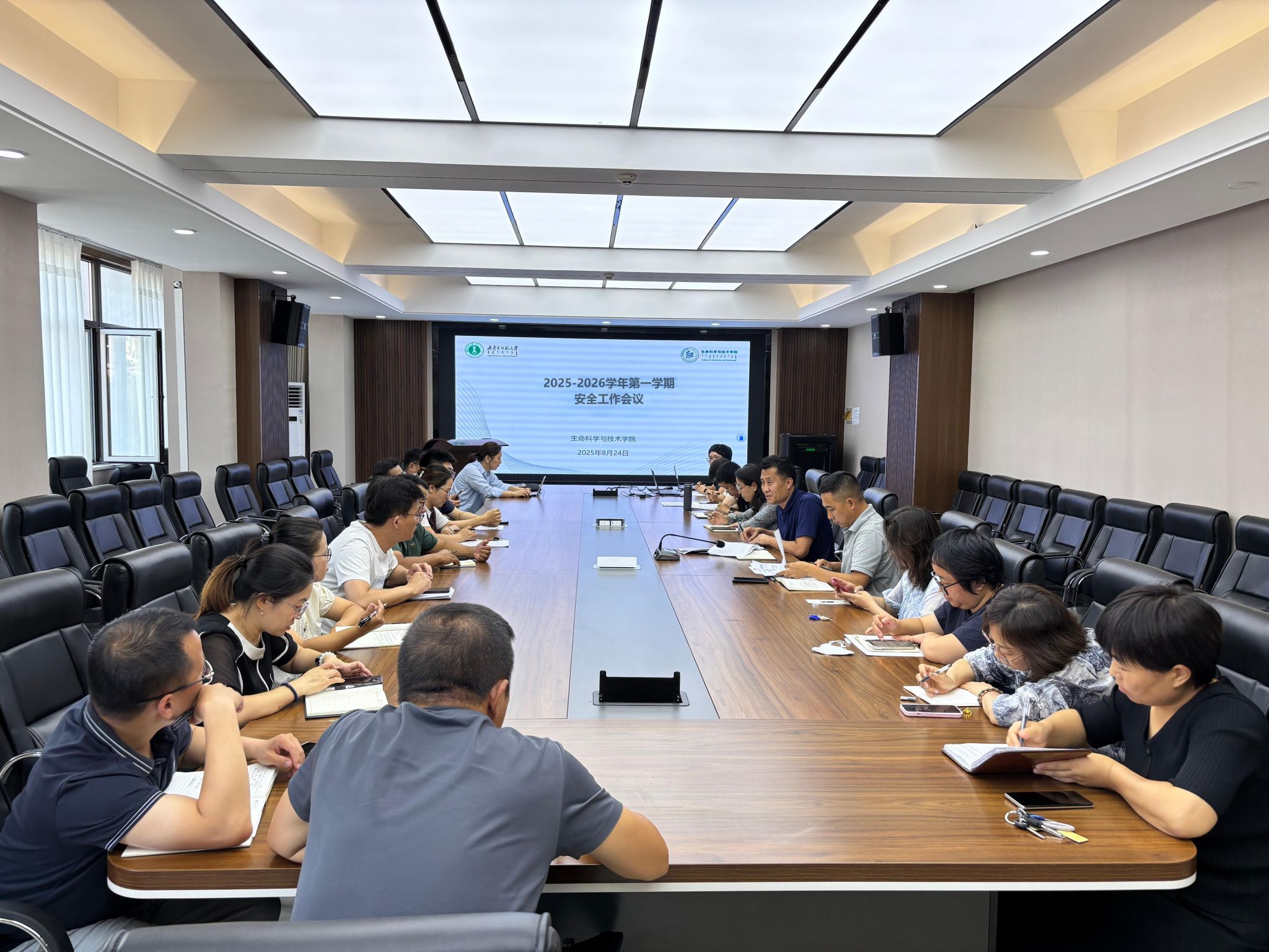 为扎实推进新学期安全工作,强化责任意识,8月24日下午,suncitygroup太阳新城官网召开2025-2026学年第一学期安全工作会议,全体院领导、各系主任、实验中心主任、学工办主任,团总支负责人、教务办相关人员、实验员参加会议。